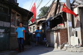 9月2日,大江胡同,两个“红袖章”在阴凉处休息。 梁莹菲/财新特约记者