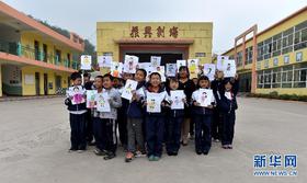 山西省孝义市碾头小学四年级的孩子们拿着为马老师画的画像和马金爱合影(9月8日摄)。