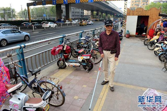 在安徽合肥市蜀山区一人行道上,盲人李国昌无法使用盲道出行(10月10日摄)。新华社记者 刘军喜 摄