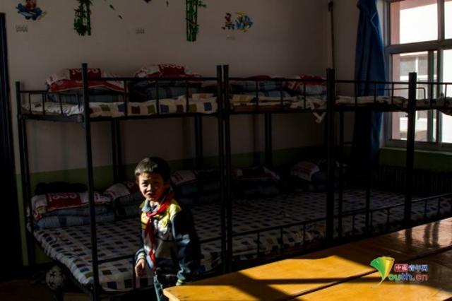 六年级的郝永庆带领记者来到他的宿舍。8张上下铺整齐的摆放在宿舍两侧,从宿舍墙上贴着的值日表上可以看到,一共有18个孩子睡在这8张上下铺。