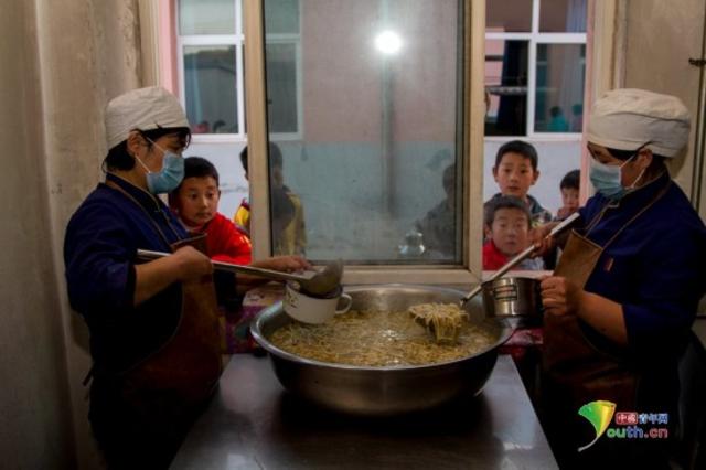 孩子们正在排队打饭,晚饭是面条。