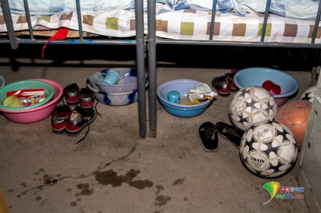 由于山区昼夜温差大,很多孩子只是脱去了外套就钻进被窝,图为床下孩子们脱下的鞋和洗漱用品,当然还有他们必不可少的足球。