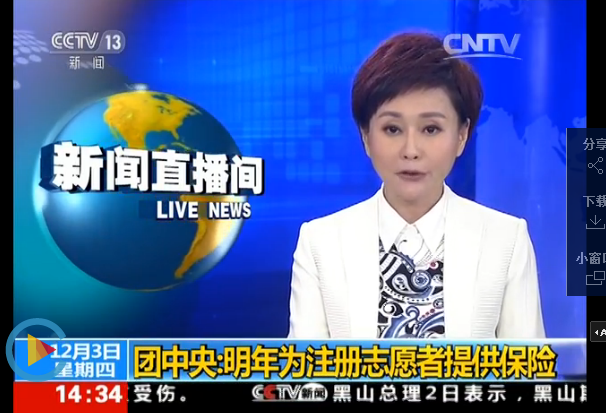 12月5号是第30个国际志愿者日,我国目前有注册志愿者2000多万,团中央将推出首份全国性志愿者保险,在2016年为全国注册志愿者统一提供志愿者保险。团中央已在会同相关部门正式启动青年信用体系建设,未来,从事志愿服务将可为信用加分。比如说创业、贷款,他都可以获得一定的优先权,参加消费、婚恋、交友都会得到一定的便利。(央视记者高晨源)