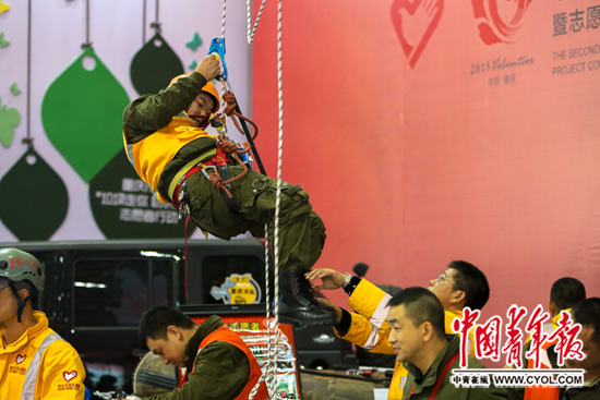 12月1日,志愿营救体验区,参会人员在体验紧急营救项目。