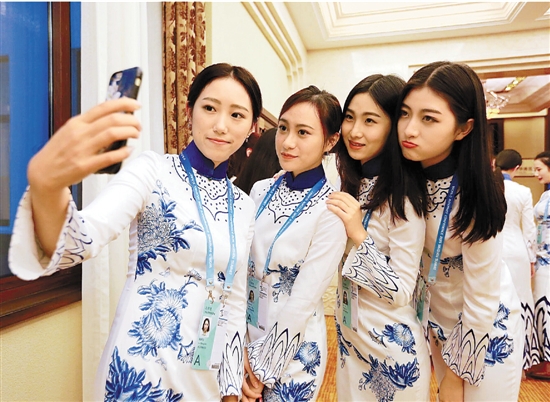 互联网大会礼仪志愿者穿青花瓷旗袍亮相