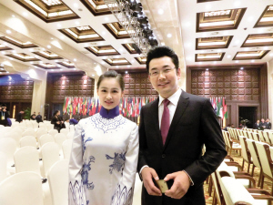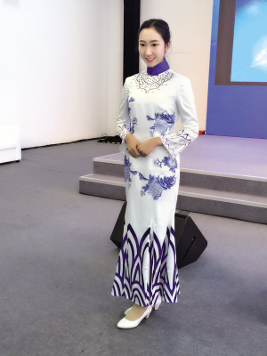 今年我们的旗袍是以杭白菊为图案,体现了江南古镇的诗情画意,也衬托出中国女性的端庄和典雅。希望我们能为大会增添一抹亮丽的色彩。
