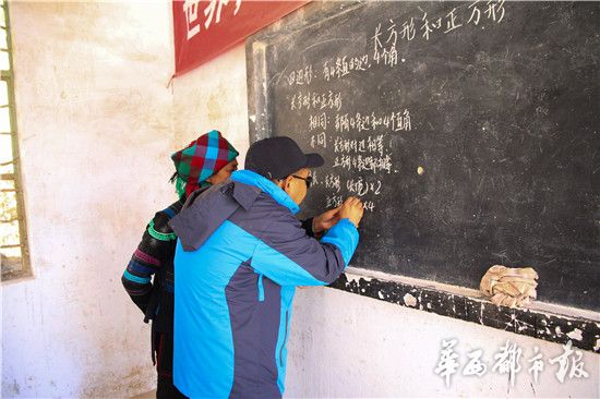 这其实是一座“夫妻小学”。马建华患眼病后,看不清楚,经常把字写漏笔画,有初中文化的杨紫琼帮助丈夫辅导学生,上课时纠正马建华的板书,检查学生作业。杨紫琼说,家里的地,现在没时间去种,也不能出去打工挣钱,因为要是她不在,马建华一个人上课,肯定会应付不过来。