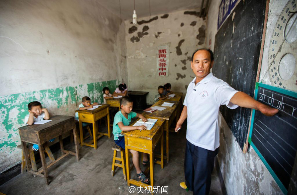 “无指”山村老师执教26年 胳膊夹粉笔写一手好板书