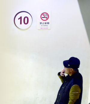 过了3分钟,一名男子走进楼梯间,他一边打电话一边吸烟。记者立即进行劝阻。虽然及时掐灭了烟头,不过他有些不服气:“你看这垃圾桶里这么多烟头,为什么我就不能抽?”“请您看一下禁止吸烟的标志牌。”记者指着墙上禁烟禁令说。这时,这位男子的口气才软了下来说:“我守在这里一天一夜了,女儿还在里面没出来,心里烦躁,想吸烟排解排解。”