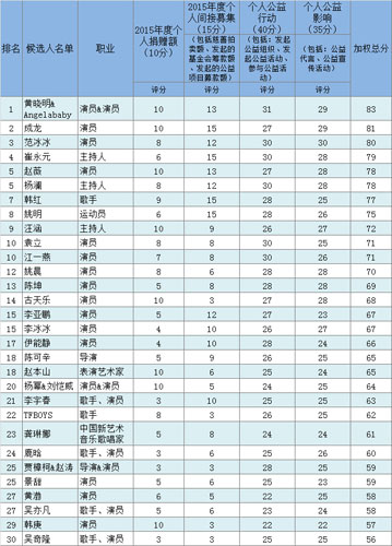 或许在民间公益日益繁荣的今天,明星慈善将会成为创建公民社会的有力的一股支流。在众多公益明星中,《中国慈善家》杂志主要依据2015年度的慈善综合表现进行榜单排名。
