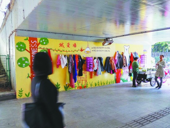 2月29日,深圳南山区立交桥下面的“城爱墙”,人们可以将自己多余的衣服和书挂上,有需要的人们则可以随时将它取走。