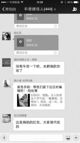 3月6日中午11点50分,曹磊的朋友石先生将求助信息转发到一个同行老乡群里。15点17分,群友邵某在微信群里发了一个100元的微信红包,并呼叫石先生代收。红包刚发出去就被群友陈某抢走,陈某意识到抢错后立即退回。此时,该红包又被微信名为“李超”的人抢走。群友纷纷呼叫“李超”,要求其退回善款,但他迟迟没有回应。