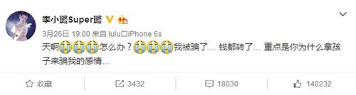 3月26日,李小璐在微博发文表示自己可能遭遇网络诈骗,自己的爱心捐款杳无音讯,并痛心追问:“为什么拿孩子来欺骗我的感情?”