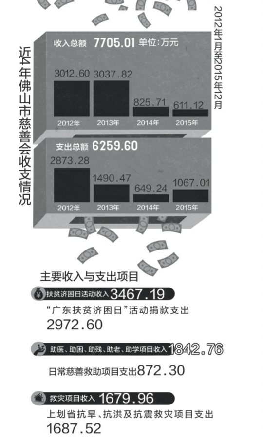 昨日会议上,佛山市慈善会对过去四年的善款收支等财务数据进行了公布,2012年1月至2015年12月,市慈善会资金总收入为人民币7705.01万元,各项慈善救助资金支出6259.60万元。