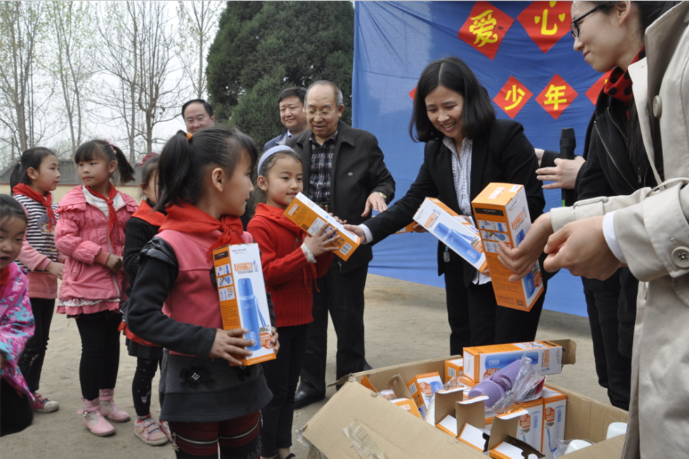 志愿者向学生捐赠保温杯