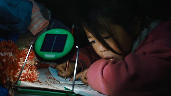 云南鲁甸,一个孩子在上学路上要有光项目组发放的太阳能灯下写作业。