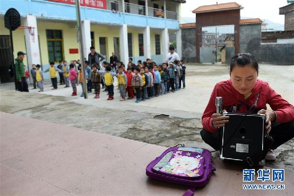 杨敏调试音箱为升旗仪式做准备。4月12日,三元岭小学进行第一次升旗仪式,旗杆是支教志愿者袁博涵自掏腰包购置的。