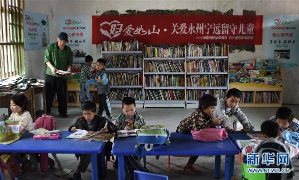4月12日,来自北京的儿童文学剧作家鲁泳北在阅读课上给孩子们发放书本,这间阅读教室里的所有书本和设施都是由社会爱心力量捐赠的。新华社记者 李尕 摄