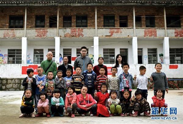 4月11日,杨敏带着孩子们和支教志愿者在三元岭小学合影。新华社记者 李尕 摄