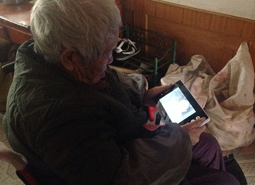 老人通过可视门铃的遥控器给客人开门。