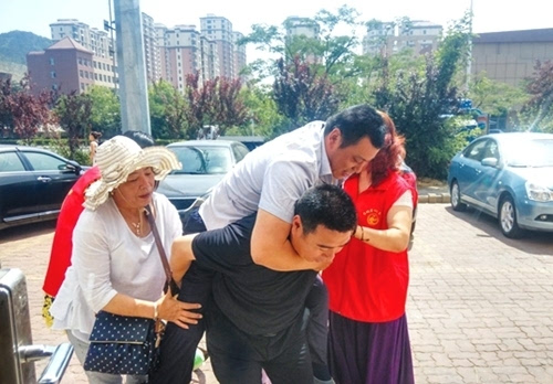 志愿者背起残障朋友进电影院。