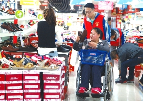 残疾人在家家悦超市体验购物。