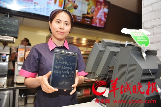 类似的装修风格、同样的员工制服,走进东峻肯德基餐厅,市民会发现它与其它肯德基无明显差异,只有偶尔看到员工用手语交流或是拿出手写板请顾客写下点餐内容,才“暴露”了他们的不同。为了让顾客理解,每台收银机前都挂着一则温馨提示:天使为您服务,请给我多一点时间,我会努力理解您的需求。