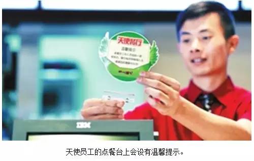据了解,该餐厅设立于2011年底,2012年6月转型为“天使餐厅”,是肯德基在全国设立的首家“天使餐厅”,“天使”员工的比例也从最初的30%增加到现在的80%。百胜餐饮中国事业部营运副总裁赵文欣表示,设立“天使餐厅”是为了给特障人士提供一个实现自我价值的平台,帮助他们更好地融入社会。