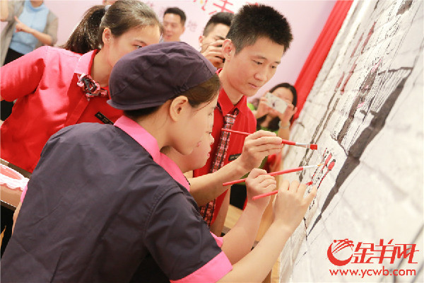 天使员工完成主题墙的最后涂色