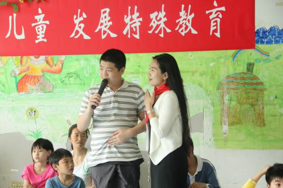 图为多粉超级宝贝“爱心大使”韩雅宁现场与特殊儿童一起表演