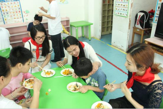 图为多粉首席体验官胡思忆女士(右三)与特殊儿童共进午餐