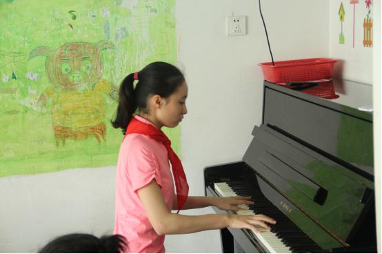 图为多粉超级宝贝“爱心大使”韩雅宁为特殊儿童演奏钢琴