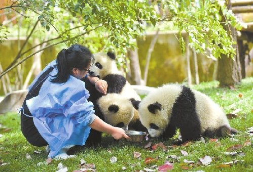 近日,一个饲养员与一群幼年熊猫“争夺”竹篓的视频在微博里热传。视频里,一个女饲养员一边扫着落叶,一边与“小国宝”们周旋,刚把落叶装进竹篓,几只熊猫又冲过来将竹篓打翻,一场混战后,落叶依旧满地,一片狼藉。