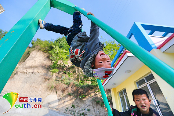 早晨上课前,5岁的杨国浩倒挂在篮球架上。中国青年网记者 张炎良 摄