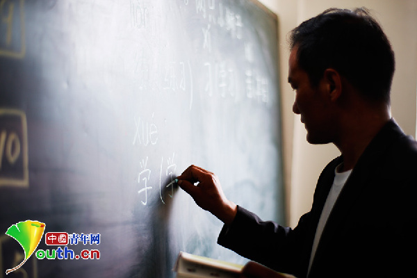 黄三英老师认认真真、一笔一划地在黑板上写下所要教授的内容。他所在的甘肃省舟曲县果耶乡真庄村,位于群山深处。这里距离兰州近十个小时的车程。从2005年起,黄三英继承父业,成为真庄小学代课教师,教村里的孩子说汉语、认汉字。中国青年网记者张炎良 摄
