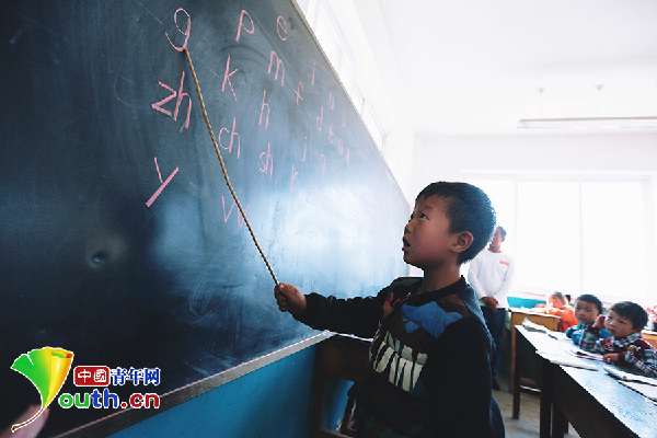 6岁的杨严国熟练地读着黑板上的拼音字母。黄三英说,村小最多的时候有四十多个孩子,少的时候二十几个人。他所教的是学前班和一年级,二年级以后孩子们会去乡里的中心校上课。黄三英坦言,自己曾经想过考公务员,但现在不想了,只想踏踏实实教书。“如果我不教,孩子们去中心校要走四五公里的山路,太小的孩子走不了,我也舍不得这些孩子。”中国青年网记者张炎良 摄