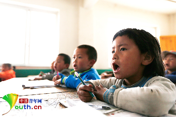 孩子们在课堂上跟着黄老师高声朗读汉语拼音字母。中国青年网记者 张炎良 摄
