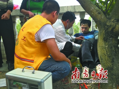 一位医生正在给病人检查身体,存心义工在一旁协助。