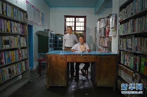 每天早晨7点,75岁的段达德老人都会准时打开院门,迎接来这里借书看书的村民们。豪山图书馆创始人之一段纯(右)和现任管理员段达德在图书馆内合影(6月14日摄)。新华社记者李尕 摄