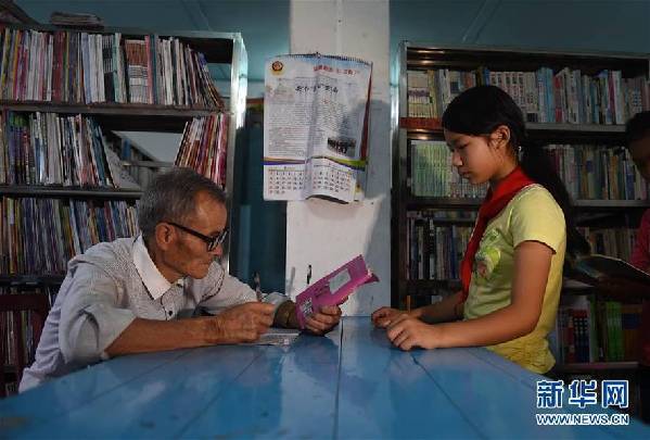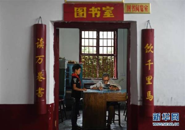 如今,“豪山八贤”中已有五位辞世,但豪山图书馆仍在发展壮大,目前图书馆已拥有藏书5.3万多册。到图书馆里来免费借书看,已经成为豪山村民的一种生活方式。豪山图书馆管理员段达德(左)为一名孩子办理借阅登记(6月14日摄)。新华社记者李尕 摄