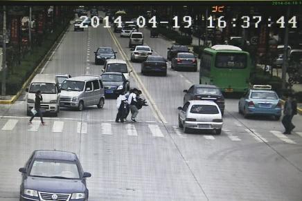 2014年4月19日下午,85岁的张大爷步行经过西安临潼区体育路十字时,不幸被一辆水泥罐车轧倒。监控录像显示,4时36分25秒,一辆公交车在十字路口停下,张大爷下车,公交车等车辆在路口等候红灯;张大爷下车后,从公交车后面过马路,穿越一个车道后,红灯变绿灯,车辆开始启动;4时36分39秒,张大爷进入快车道,紧贴着驶来的一辆水泥罐车想跑过马路,张大爷被撞倒在车下;水泥罐车没有停下,直直开走,张大爷半躺在马路上,似乎在呼救。事发的108国道车来车往,没有一辆车停下,很多车都缓缓经过观望。