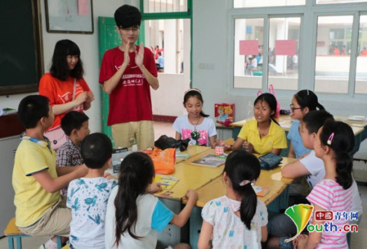 实践队队员在爱心小课堂上和孩子们交流。实践队供图