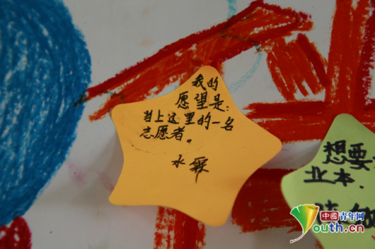 实践队制作的心愿墙,一个孩子写下“当一名这里的志愿者”的心愿。中国青年网记者 周学磊 摄