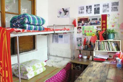 杨友周的寝室,位于新农中心校校园内的一个角落里,寝室分内外两间,内间摆放着三张上下铺的单人床,是学生睡的;外间仅5平米左右,摆放着一张上下铺的单人床,上铺是学生睡的,下铺则是杨友周的床位。旁边是图书角,摆放着一些书籍供学生们随时阅读。这就是杨友周从2014年8月到新农中心校工作以来,每天晚上休息的地方。