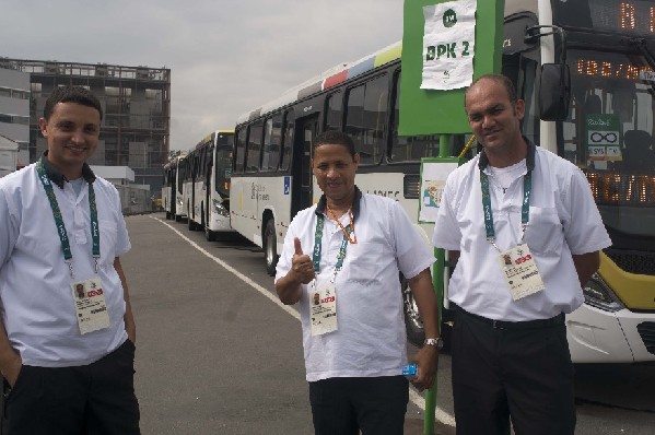 三名志愿者7月31日在里约奥运主新闻中心前的摆渡车前合影留念,他们为需要前往场馆的记者们提供路线说明等帮助。