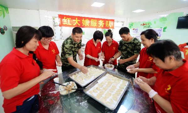 7月30日,“红大娘”志愿服务队队员与官兵一起包饺子。新华社记者 王晓 摄