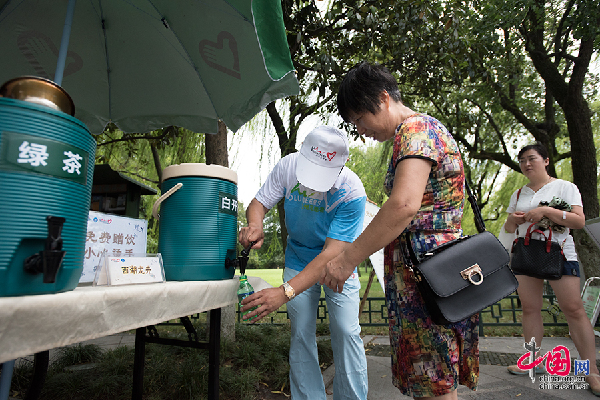 8月3日,杭州西湖景区,志愿者为游客免费提供凉茶和白开水解暑。中国网记者 张若梦 摄