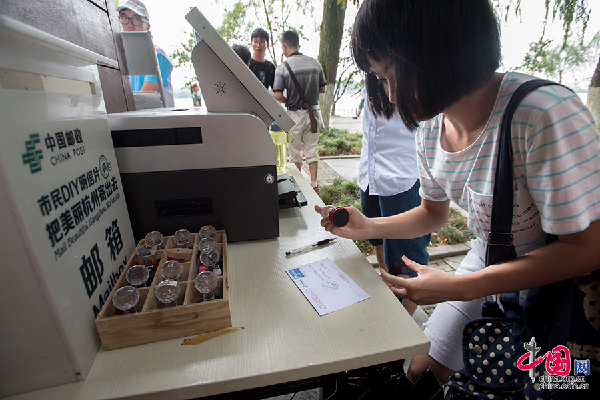 8月3日,杭州西湖景区,柳浪闻莺“微笑亭”志愿者服务站为游客提供照片即时打印和邮寄服务。中国网记者 张若梦 摄