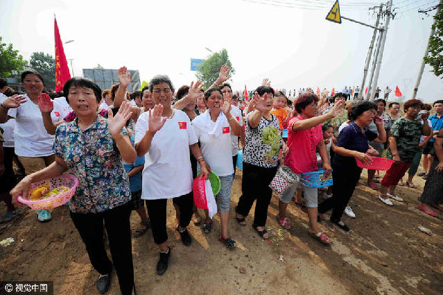 2016年8月4日,河北邢台,抗洪官兵撤离,百姓洒泪挥别。 图片作者:冰咖啡/视觉中国