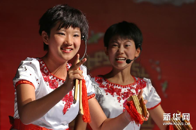 8月14日,秦皇岛市抚宁区文艺志愿者在表演河北省非物质文化遗产“抚宁太平鼓”。